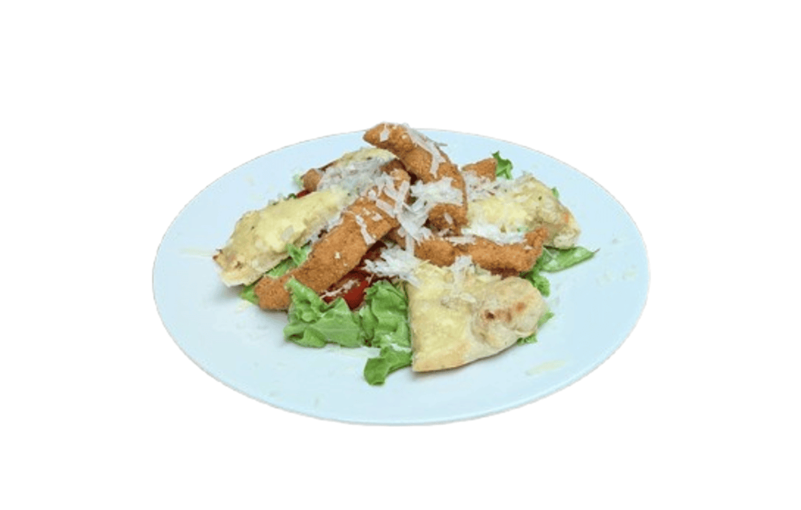 Ocvrt puran, slanina, jajce, preliv, česnov kruhek